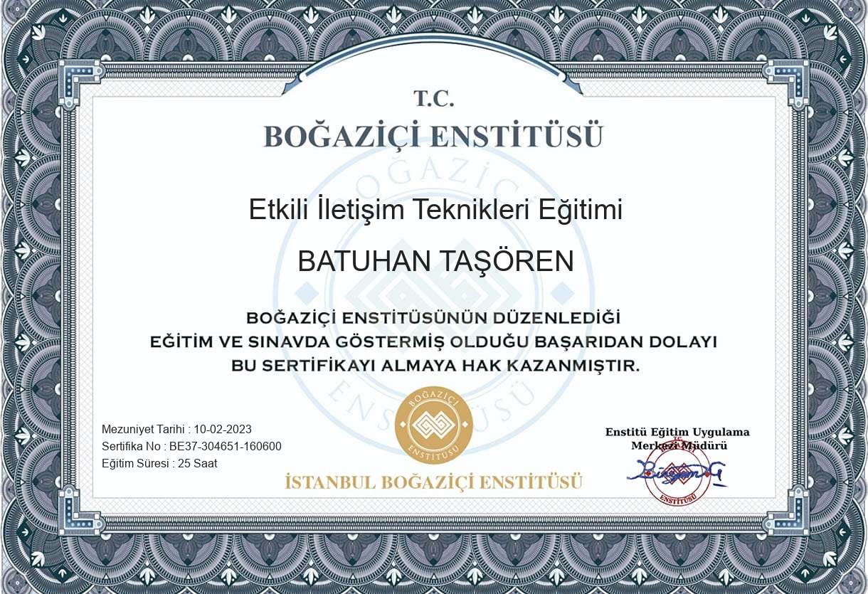 Boğaziçi Enstitüsü; sertifikasını almaya hak kazanan katılımcısının, tüm resmi ve özel kurumlarda referansıdır. Katılımcısının bu sertifikayı, online takip sisteminin kontrolünde üstün başarı göstererek aldığını belirtir. Katılımcısının ilgili tüm derslerini tamamlayarak ve eğitim bitirme sınavını başarıyla geçerek sertifikasını almaya hak kazandığını bildirir.