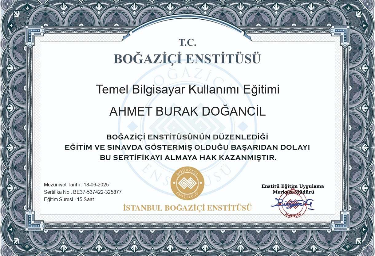 Boğaziçi Enstitüsü; sertifikasını almaya hak kazanan katılımcısının, tüm resmi ve özel kurumlarda referansıdır. Katılımcısının bu sertifikayı, online takip sisteminin kontrolünde üstün başarı göstererek aldığını belirtir. Katılımcısının ilgili tüm derslerini tamamlayarak ve eğitim bitirme sınavını başarıyla geçerek sertifikasını almaya hak kazandığını bildirir.